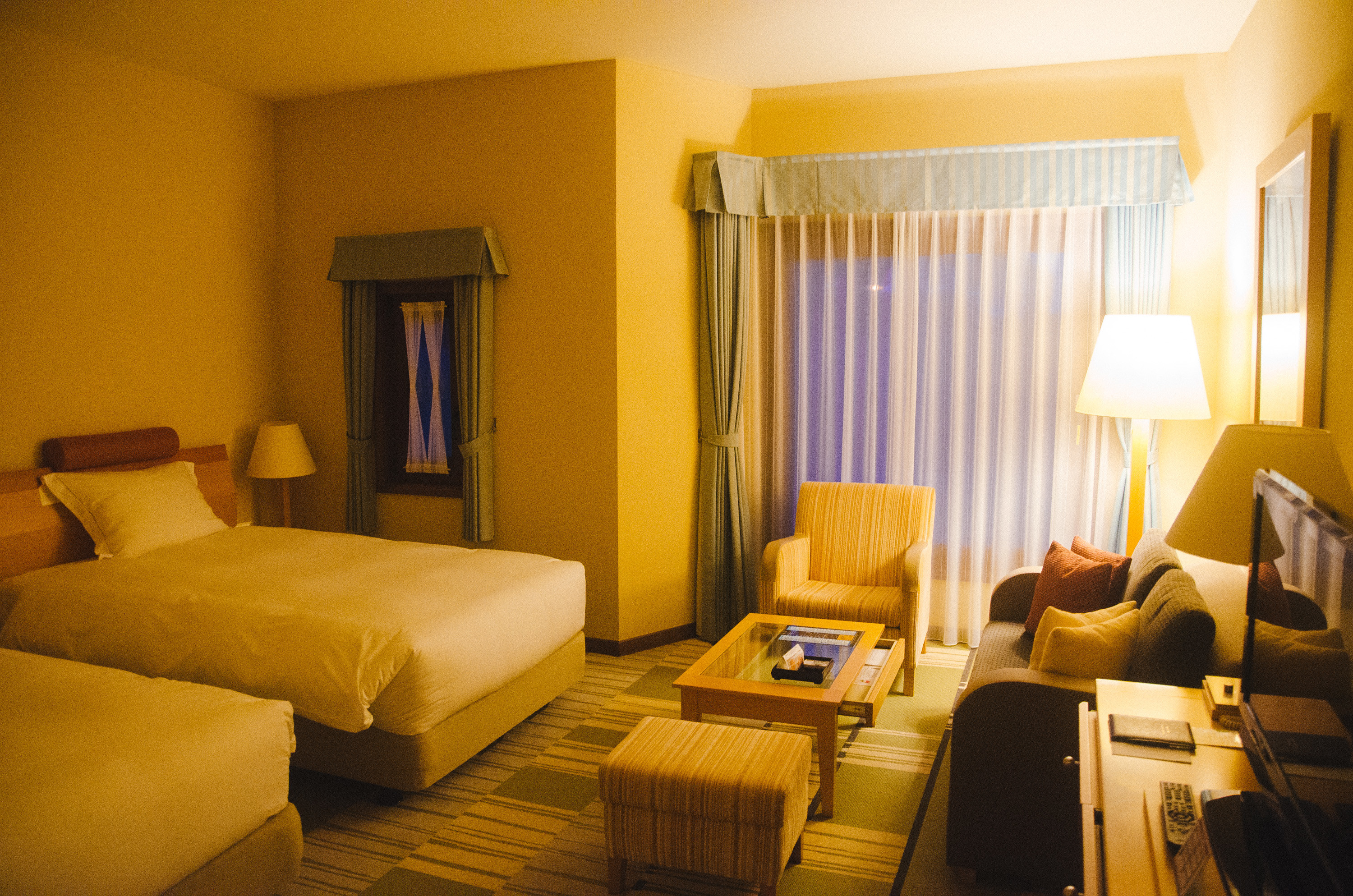 部屋はごく普通のホテルなのだけど、窓からみえる風景は高原のリゾートホテルって感じがする。比較的部屋が広いのでゆったりしているのもいい。荷物置きのスペースが多いのはスキーリゾートを兼ねているからなのかもしれないが、これがなにかと便利。