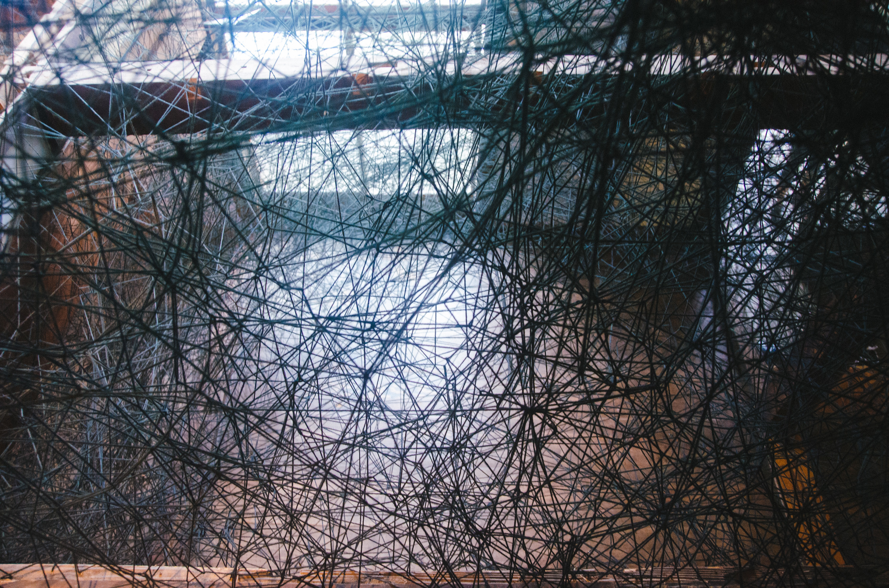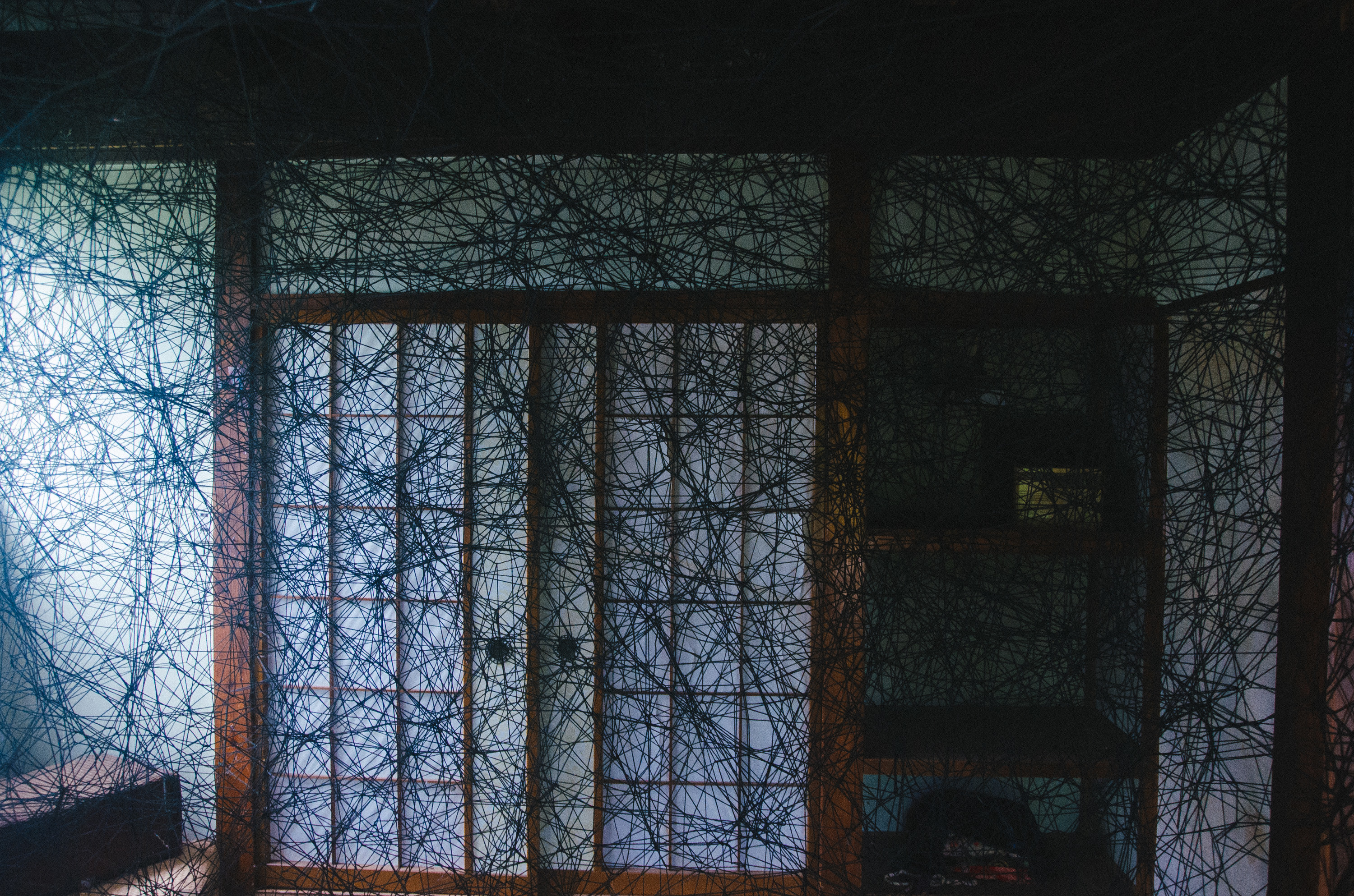 黒い毛糸が廃屋のなかを縦横無尽に張り巡らせてあり、いまの奥には置物がある光景は、はじめてみたときは怖さすら感じる。