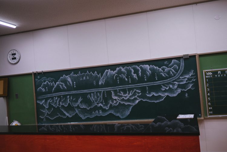 古い学校の家庭科室が会場、黒板には越後妻有の風景