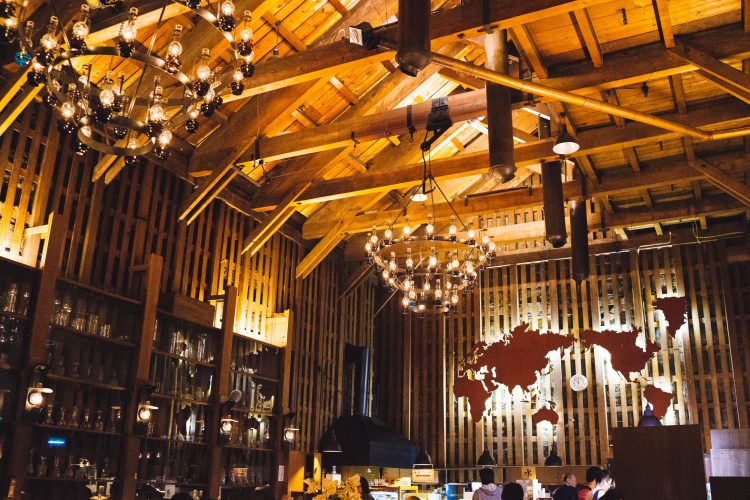 店内には壁やテーブル、シャンデリアまで合計で167個のランプが灯されている。これだけあるとメンテナンスが大変そう。そして、いまではLEDのランプとかも出まわる時代に、あえてこのちょっと揺らめく石油ランプの光は眺めていてひきこまれる感じがする。店内をぐるりとめぐるランプは小さな花が咲いているみたいにもみえる。
