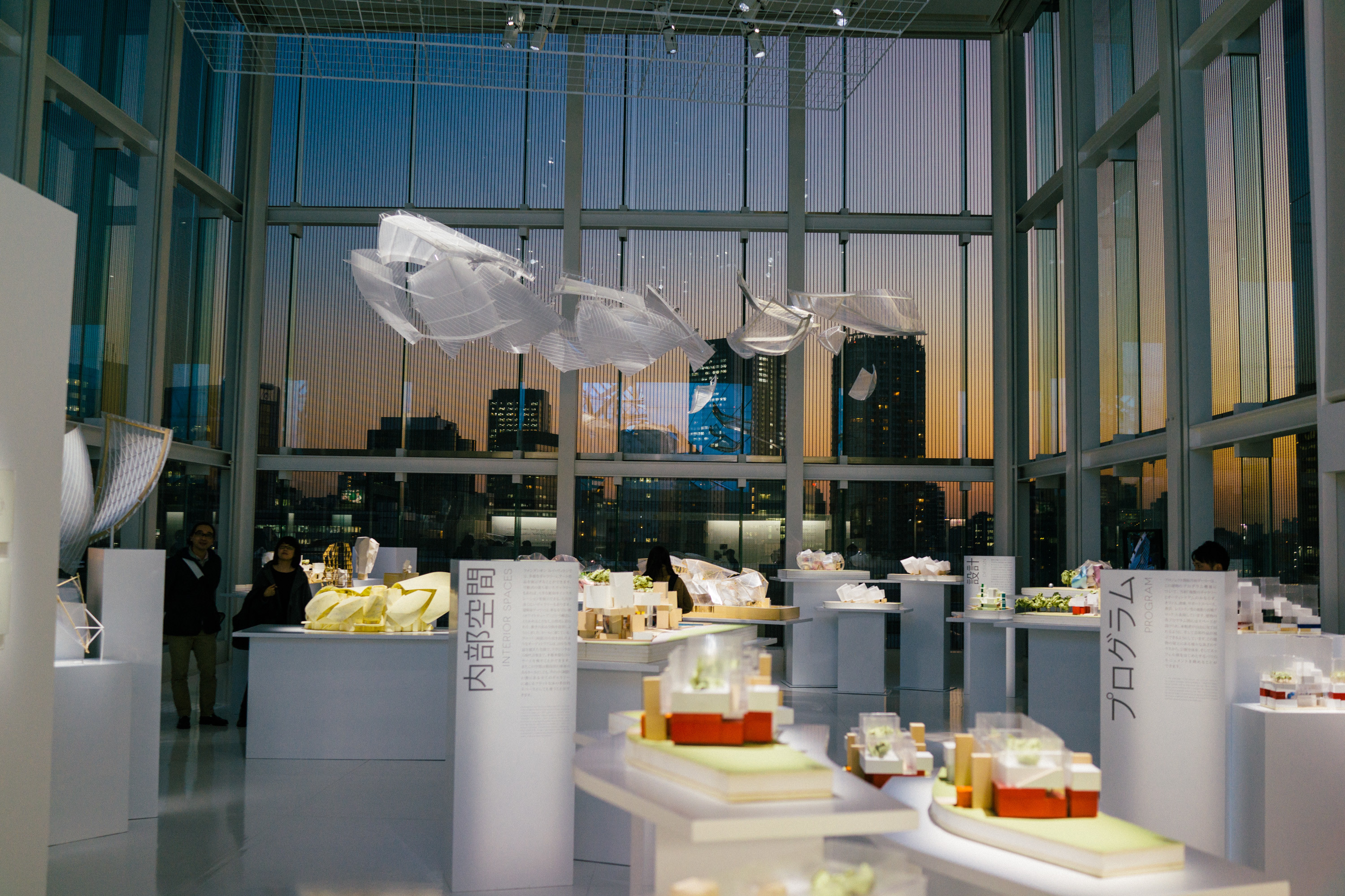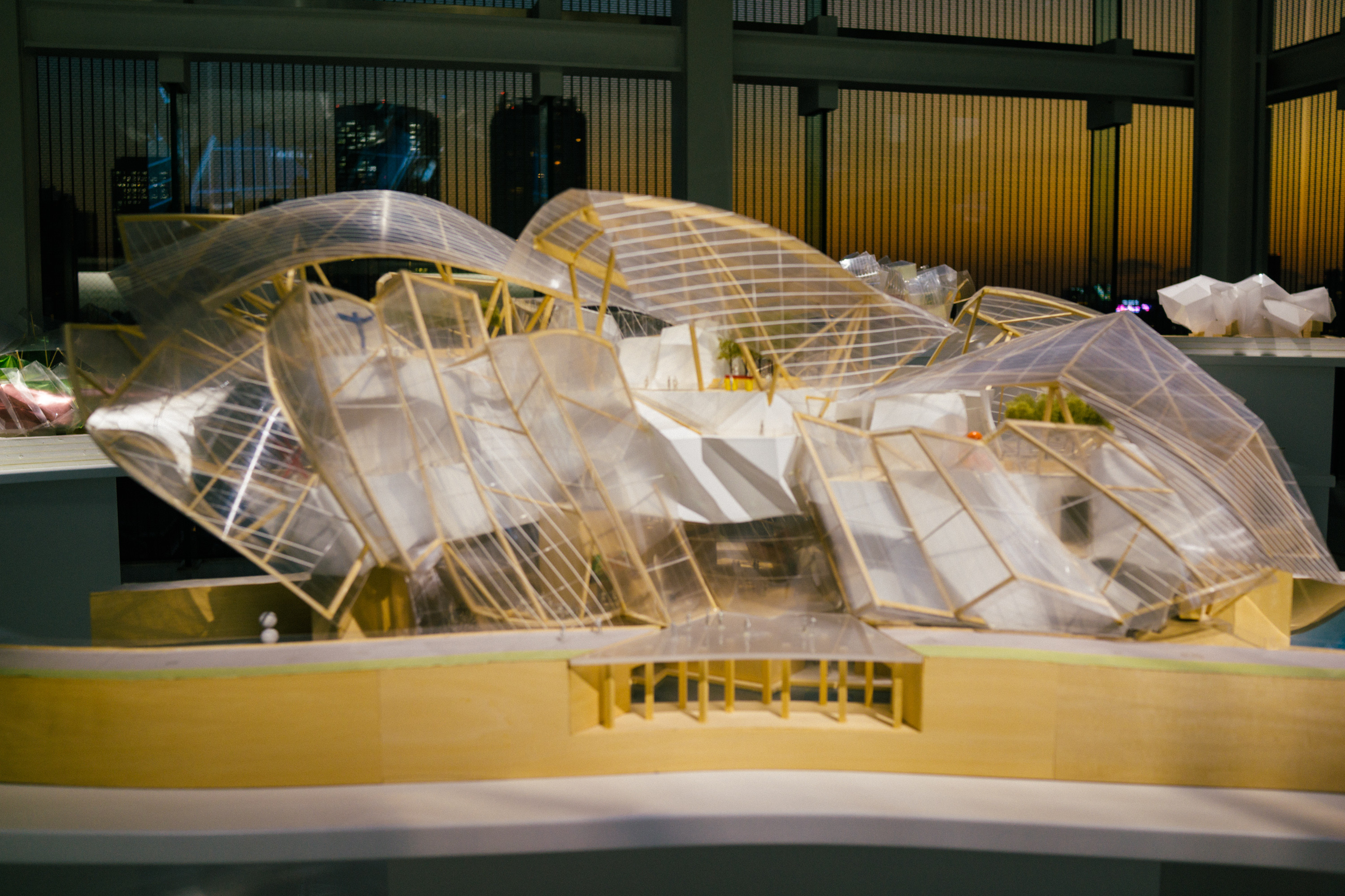 この建物が出来上がるまでの模型やスケッチの展示、さらにルイ・ヴィトンとフランク・ゲーリーの関わりあいのようなものも含めたインスタレーション、ちょうど訪れたタイミングが夕暮れどきだったので、美しい東京の夕暮れもあわせせて印象に残っている。