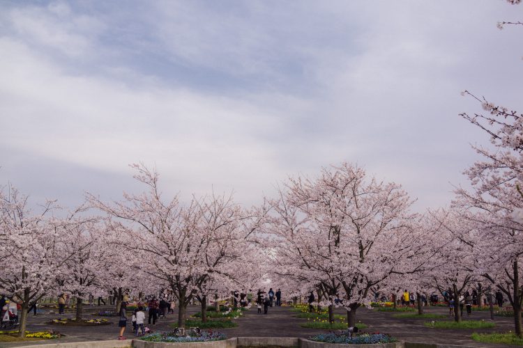 園内はフラットな状態ではなくて、ちょっとだけ傾斜が作られている。なので、同じ桜が並んでいるのに、みる場所によっては印象が異なり、ちょっと奥の方にいくと桜のトンネルを見渡すような風景がみられる。
