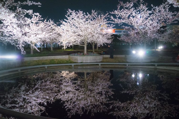さくら広場は安藤忠雄が設計をしていて、整然と並ぶ桜が印象的な場所。楕円形をした休憩所と、奥には小さな丘がありそこには噴水があり、アクセントになっている。