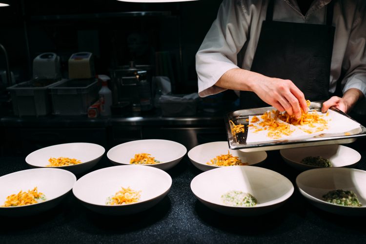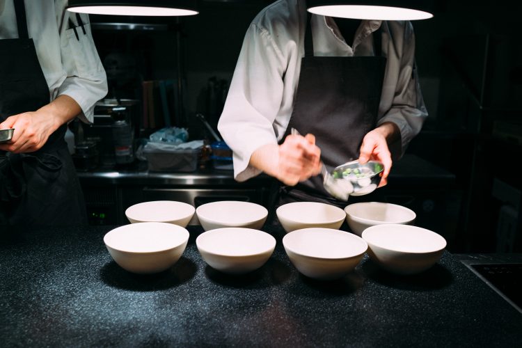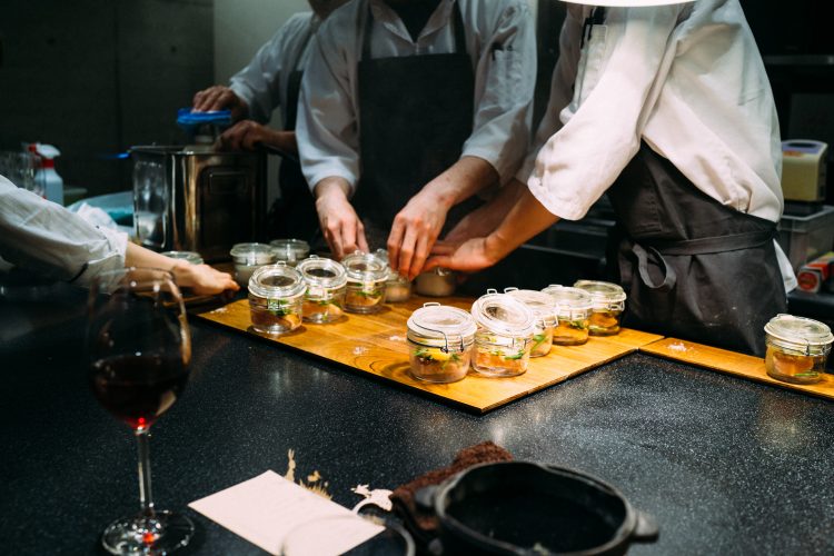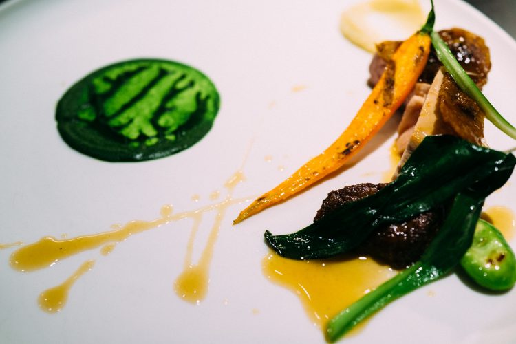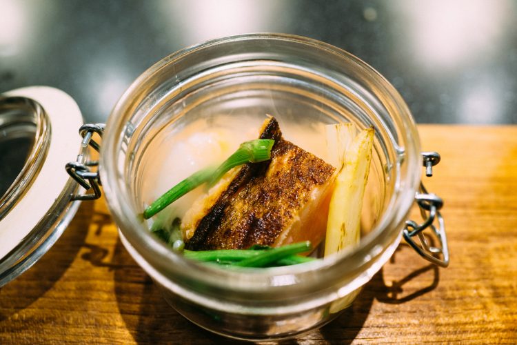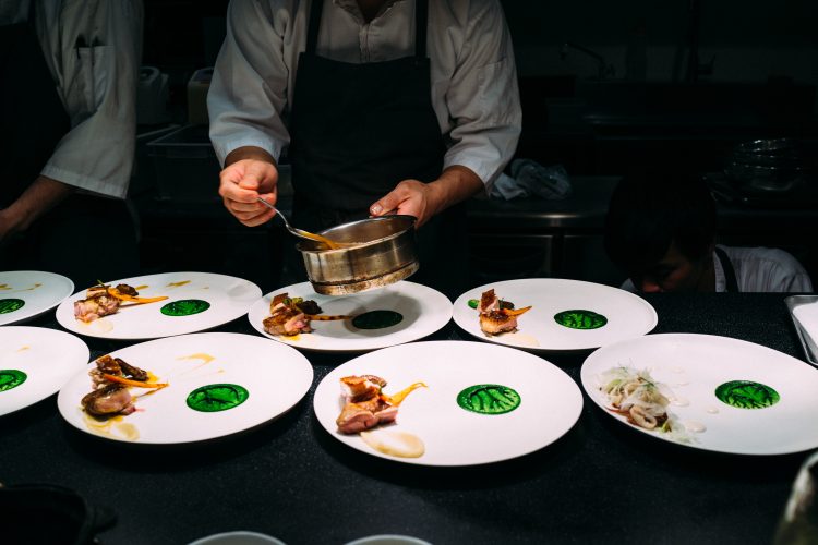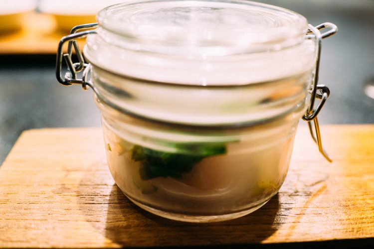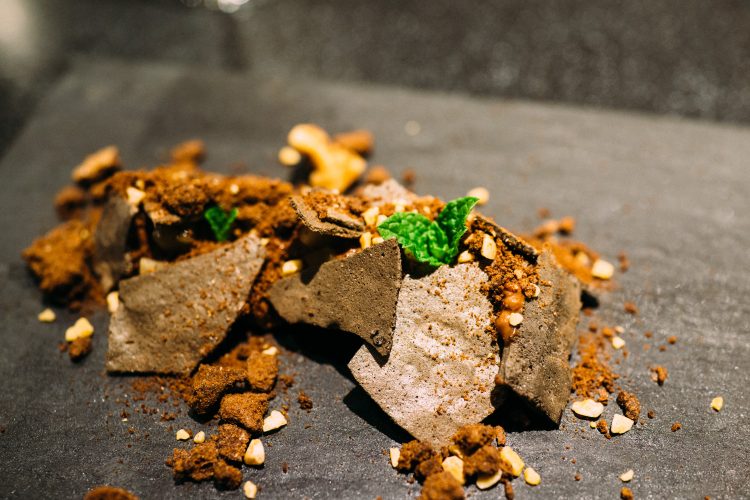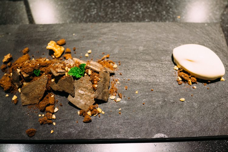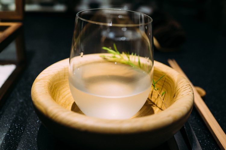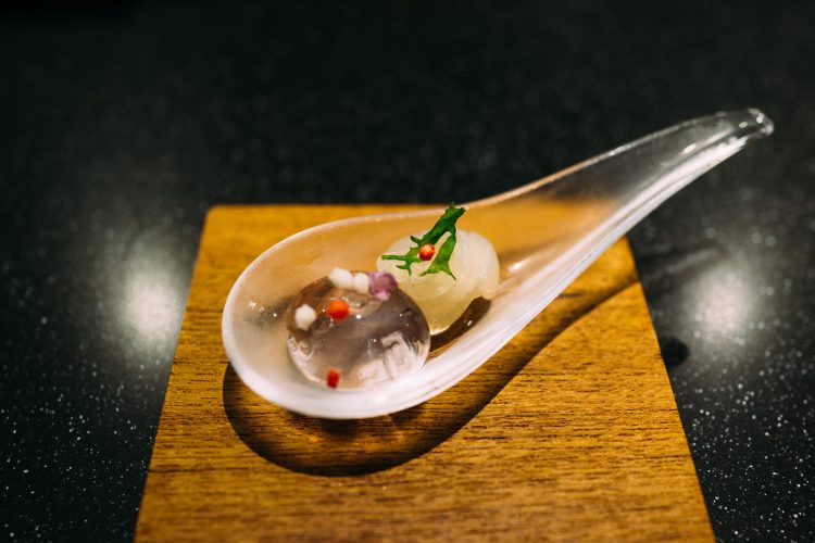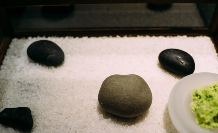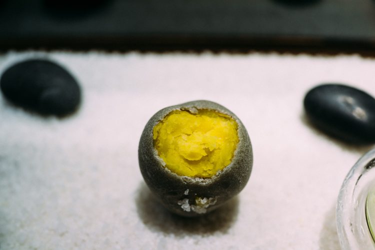 続いて出てきたのは枯山水。下の白砂は岩塩でできている。岩のひとつがジャガイモで出来ていて食べることができる。アボガドのムースで食べるのだけど、なかがほくほくでこれは絶品。アボガドのムースみたいなのが溶けてしまうので急いで食べた。