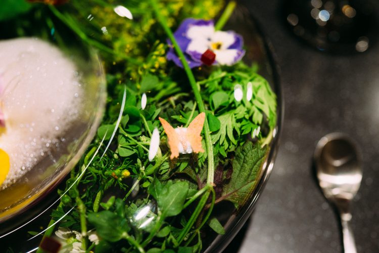 去年も感動した春の高原。お皿というか容器のなかに高原の草花がいれられていて、その上には泡というかスープというか、花の香りがするものだった、お皿のまわりには蝶々が舞っていてまさに春の高原の風景。