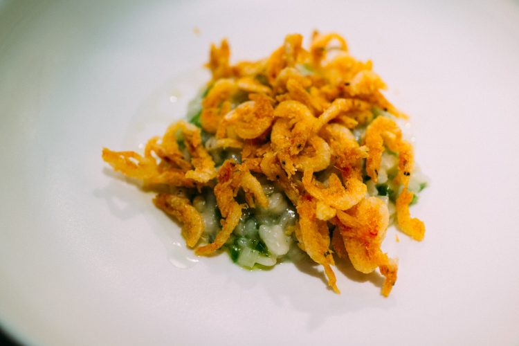 そしてリゾットっぽいもの「桜海老 ウド 海藻」というそのままの料理名。桜海老の食感はえびせんみたいなのかと思ったら、全然違っていてふっくらとした感じでこれは美味しい。海藻がはいったリゾットの風味もまた優しい味わいで日本を感じさせるものだった。