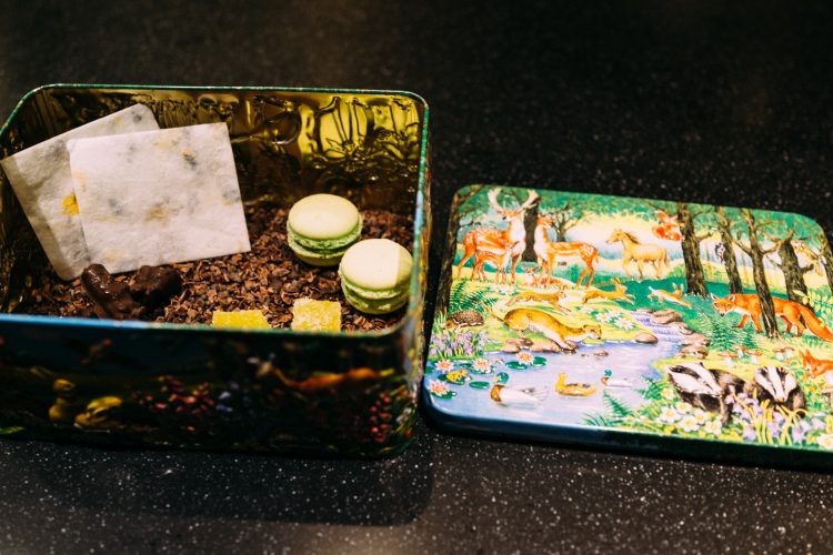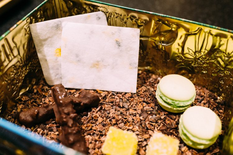 最後のデザートは、おもちゃ箱みたいな缶に入って出てくる。このなかで、もっとも驚いたのは和紙というデザート。綿菓子を紙のように作り上げて、なかにエルダーフラワーの押し花をいれるというもの。