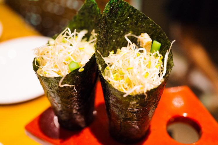 手巻き寿司のコーナーでは、お米を使わない、野菜だけで作られたお寿司なのだけどこれもまた美味しいのです。複数の種類のスプラウトをお米のように使っていて、そのしゃきっとした食感とたれの味がまた絶品。ひとりで何本も食べることができる。