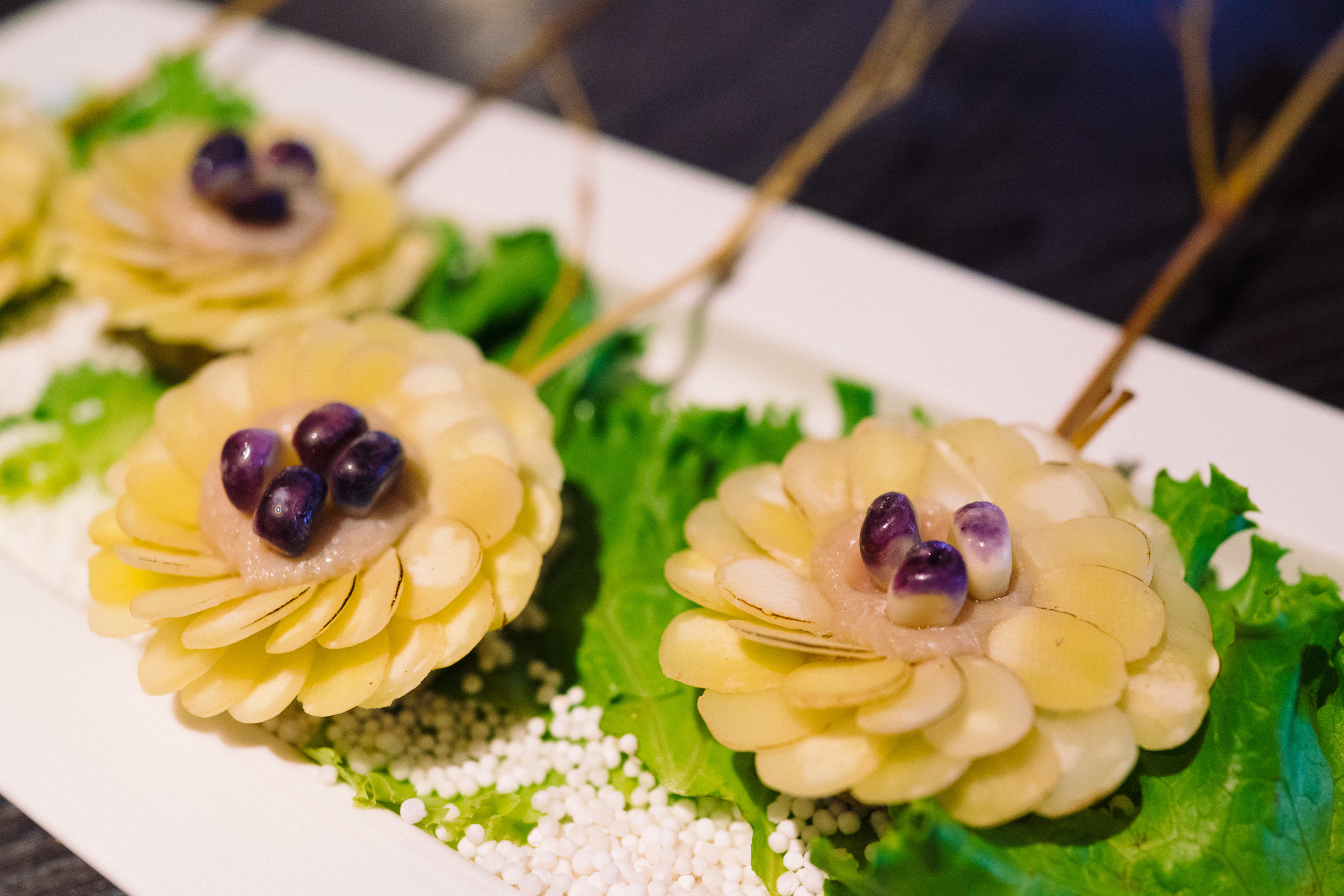 スイーツのような見た目なのに、どれも火鍋の具材であるというのがまた面白い。とくに、薔薇のようにアレンジされた豚肉はフラワーアレンジメントみたいで、半冷凍された食材が美しく盛り付けられている。