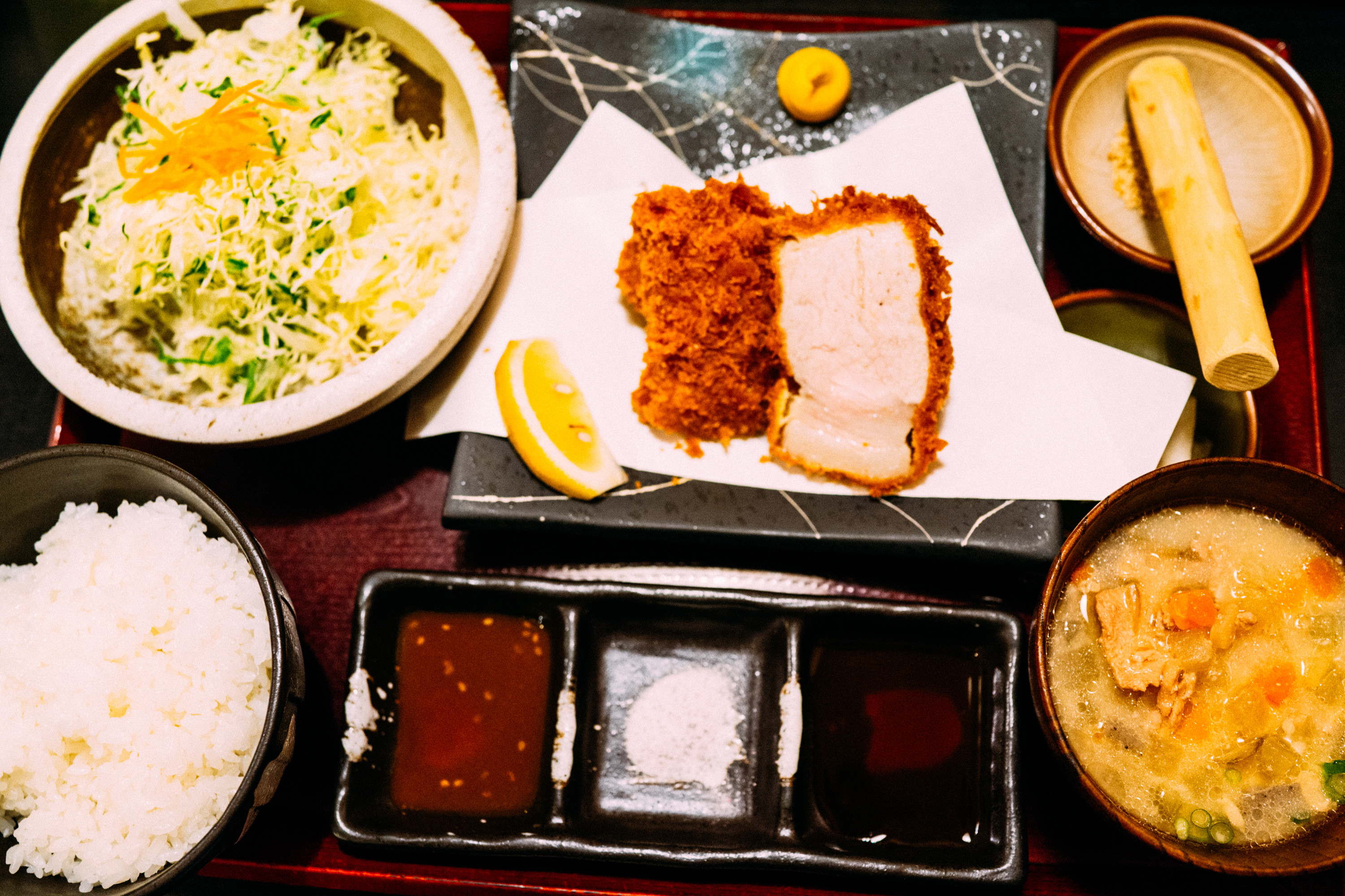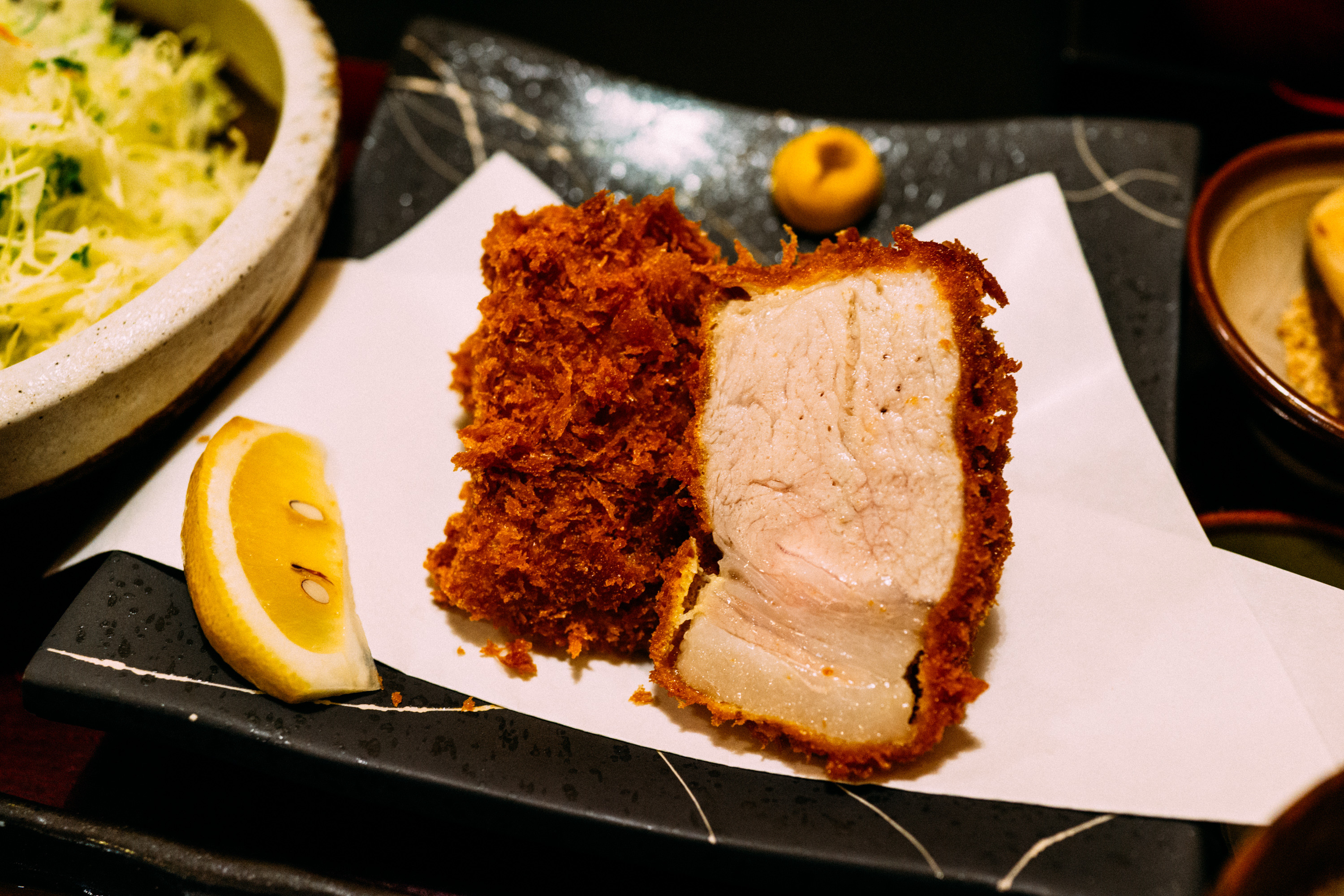 出てきたとんかつの肉の厚さは驚愕に値する幅で、すごくフォトジェニックだと思う。これは美味しそうだが噛みきれるのだろうかと思ってしまうところでもある。しかし、なんというか、めちゃめちゃ柔らかい肉は旨みが凝縮されていて、甘みすら感じるくらい。豚肉特有の匂いがあるのだが、その匂いも甘く感じる。そう、甘みを感じる肉というのがすごい。