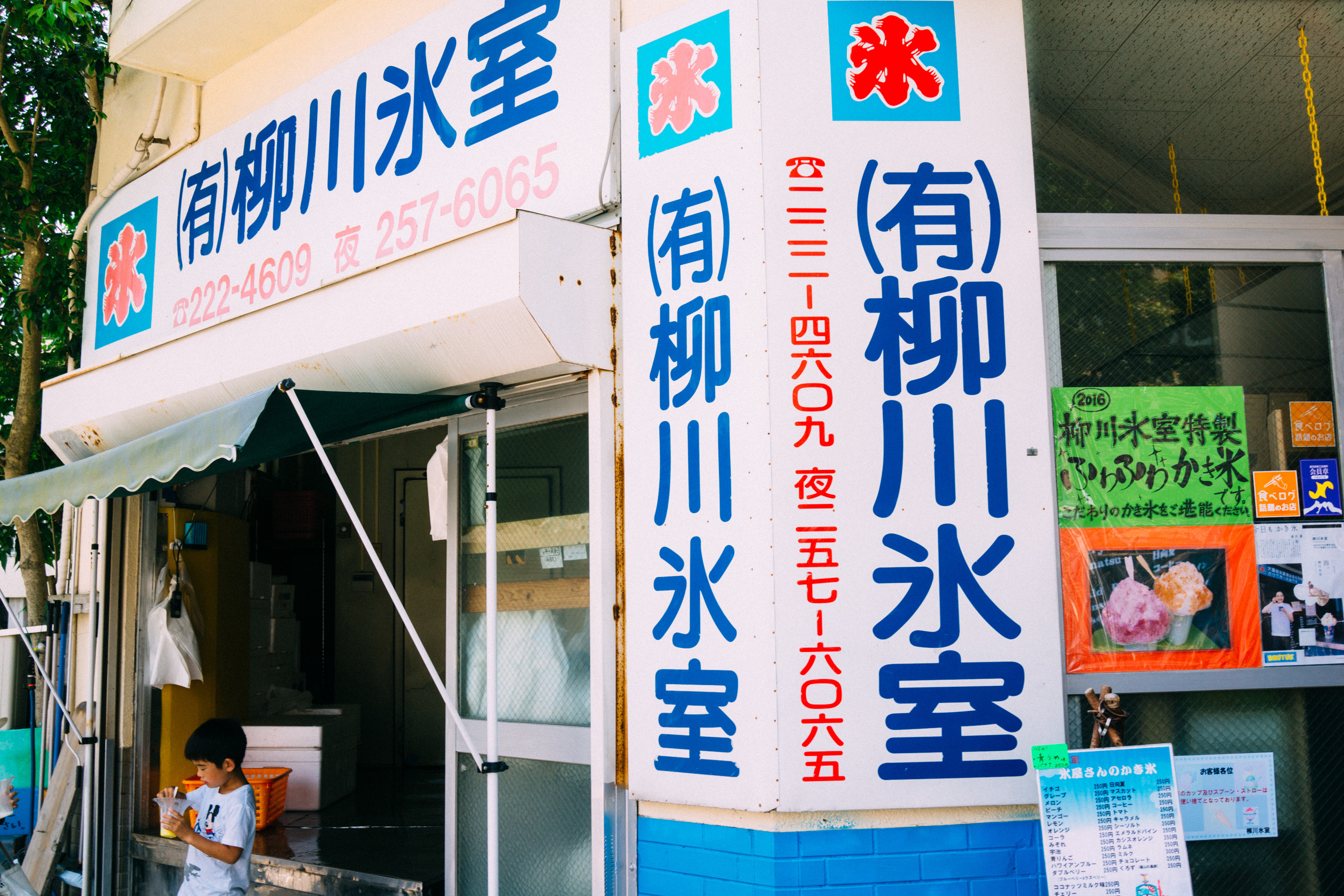 ということで、コインパーキングに車をとめてやって来たのはこちらの柳川氷室。氷屋さんがやっているかき氷店のようで、店先では氷を切り出したりしているのがみえる。