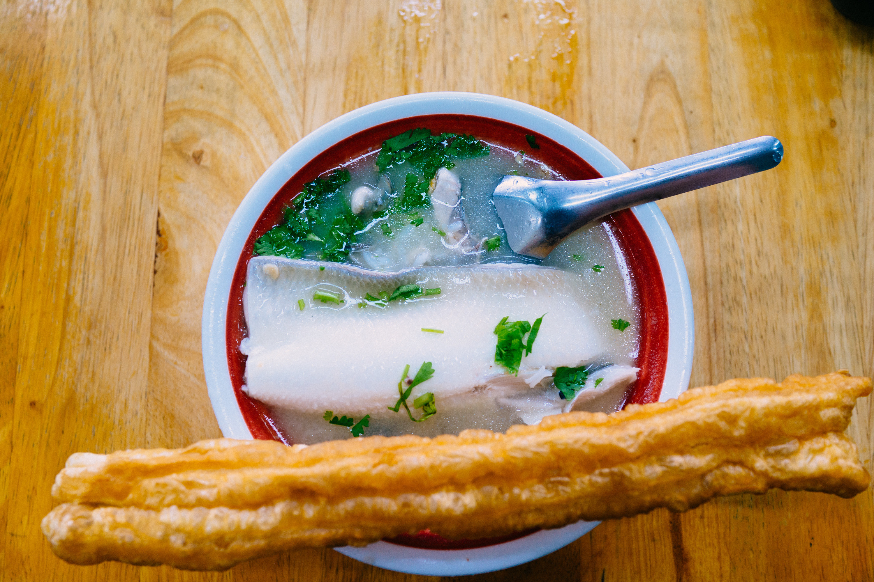 「虱目魚肚粥」と油條を頼むのがおすすめ。冷凍されていない新鮮なサバヒーを小骨までも取り除く処理をしてあり食べやすい。魚のお粥って考えると臭みがあるんじゃないかと思うかもしれないが、本当に新鮮なものを使っているのだろう、ぜんぜん臭みがない白身の魚は絶品。脂がすごいのっていて、その風味がお粥のスープにも溶け出しているので、一心不乱に食べてしまうはず。とくに背脂の身の部分はとろけるような感じで食感も最高。