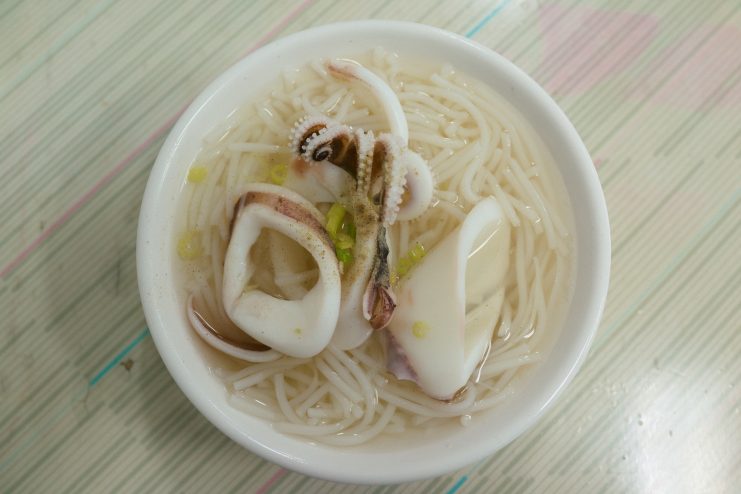 台南の小吃グルメのなかではあっさりした風味で、朝に食べるとしみじみと美味しい。メニューはビーフン入りのイカのスープである小巻米粉と、イカだけのスープである小巻湯の二種類のみ。