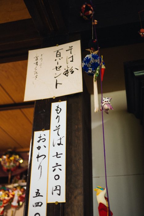 メニューは「もりそば」のみ。十割蕎麦ということだけどかなり手頃な値段。量はそれほどでもないのと、頼んでから出てくるまでに時間がかかるので、たくさん食べたい人は最初から「おかわり」を追加して頼んでおくのがこのお店のやり方っぽい。