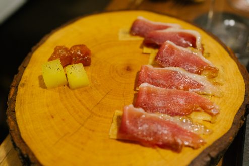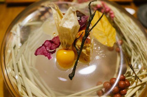 燻製のような処理をする料理は、今回はちょっと変わっていて(いや、いつもだが)、透明のフィルムで覆った下側に燻製の煙を閉じ込めておき、小さな穴から出てくる煙を一緒に食べるかのようにしていく。奥久慈のしゃもはかみ応えがある濃厚さがあり、ほおづきの実もまた美味しい。
