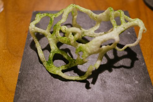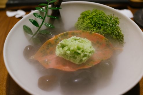 森の朝はピスタチオのクリームを液体窒素で瞬間的にこおらせて、下からドライアイスの霧が出てくる料理。舌の上にのせると溶けるような食感が不思議で美味しい。