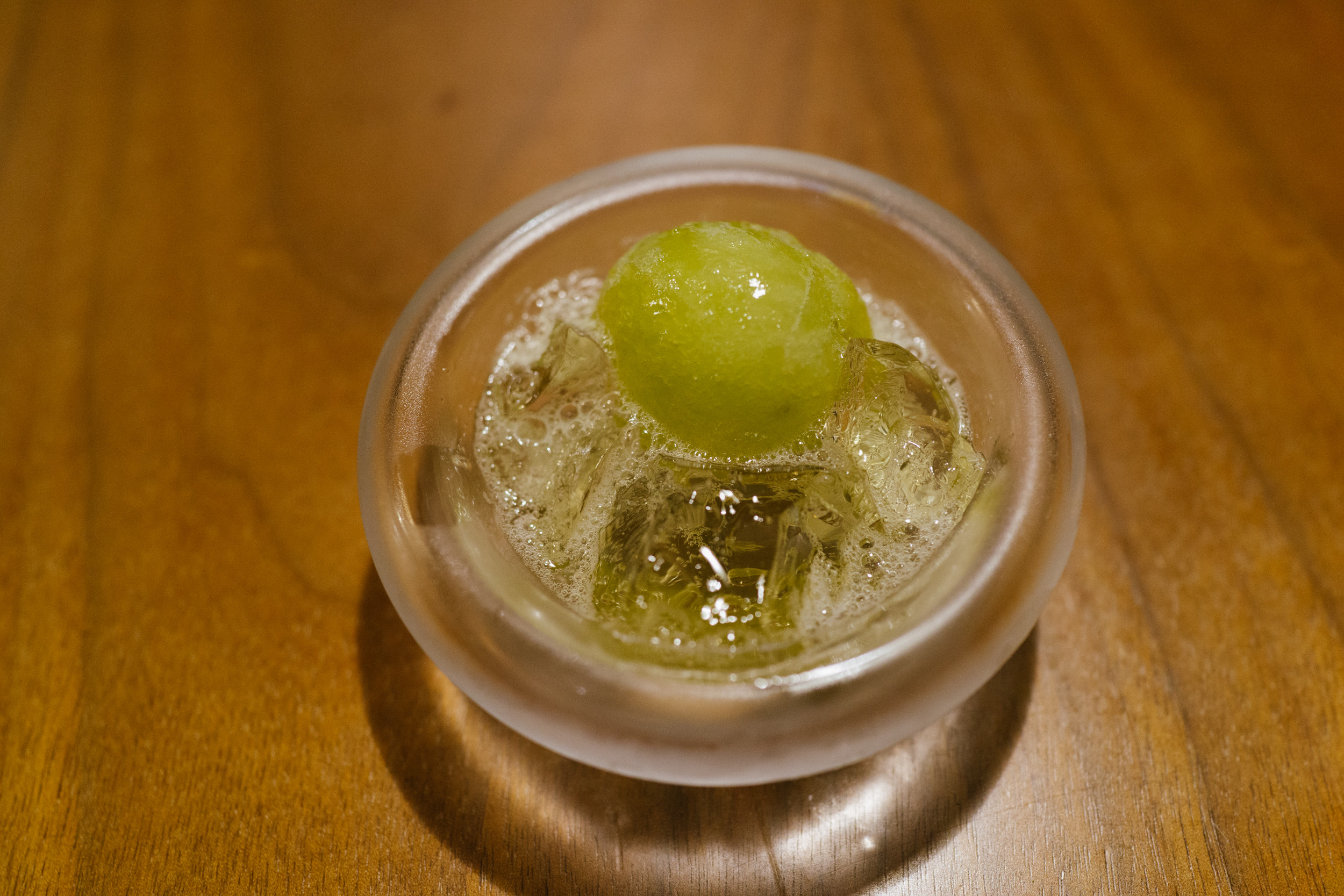 コースのスタートはマスカットを炭酸ガスで包み込んだスパークリングマスカット。ちょっとしたシャンパンのような感じでもあり、口の中にいれた食感がまた楽しい。