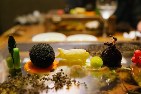 箱の上には森の中にあるような世界。樹木のようなアスパラガスや、木の実のようなトリュフ。豚のなかには香りのついたオイルが入っていて、どこまでも手が込んでいる。