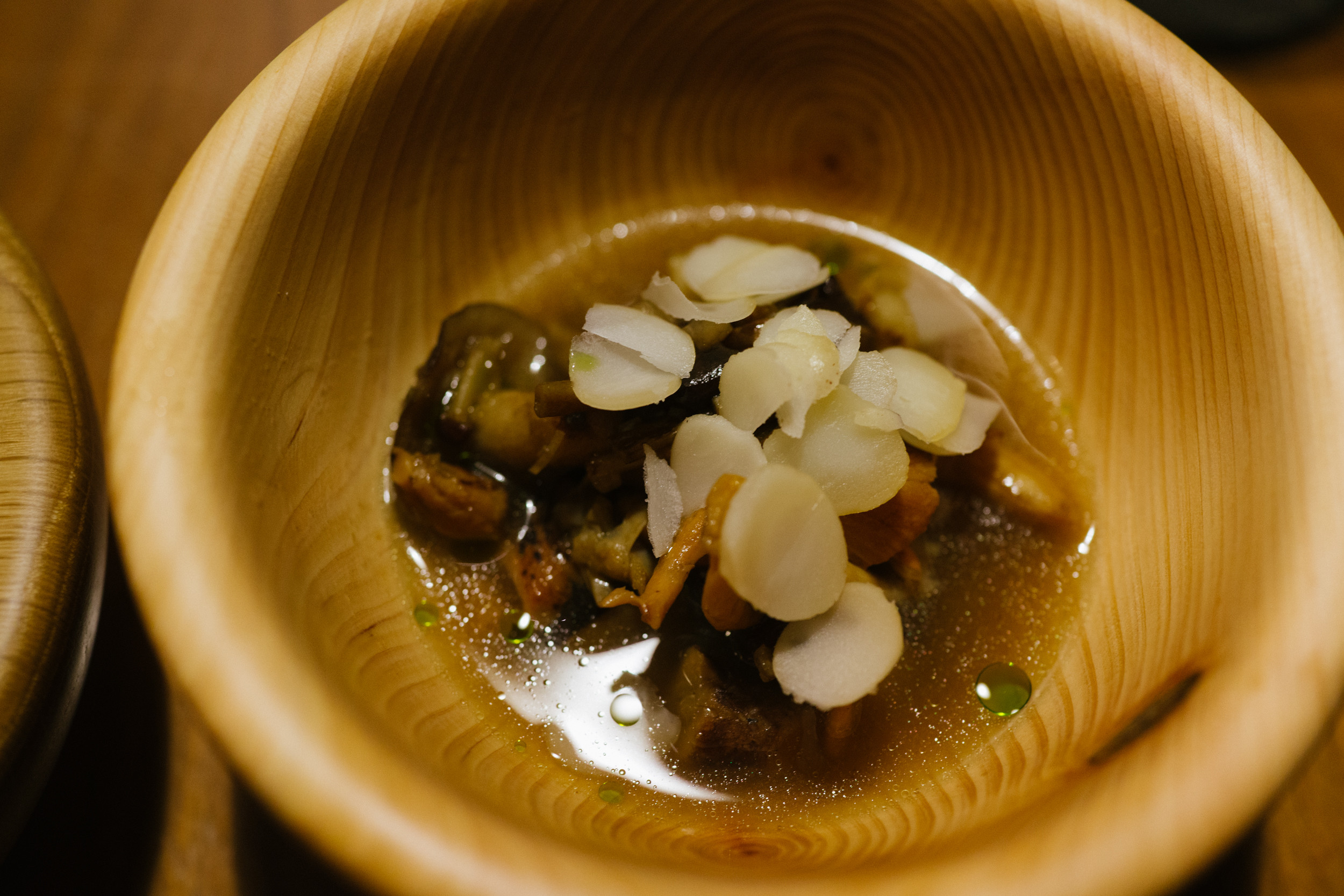 デザートは圧倒的に面白かった。表面を茶色いなにかで覆われたどんぶりみたいなのが出てきて、上を覆っているのは栗のシートだという。このシートを壊して下に入っているチョコレートやどんぐりのアイスと一緒に食べるというのだが、このシートのぱりっとした食感とアイスがあわさってすごい美味しい。こういう遊び心ある料理ってどうやって思いつくのだろうかっていつも思っている。