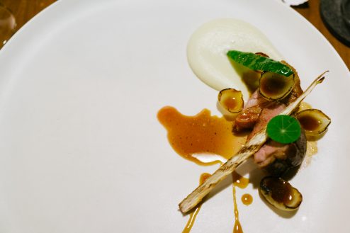 メインの肉料理は鴨を焼いたもの。つけあわせの小さなタマネギがいいアクセントに効いている。そして、このときにペアリングで飲んでいたグレープフルーツジュースを塩で味を調え、バジルで香り付けするドリンクがすごく美味しい。グレープフルーツジュースだけど、違うカクテルみたいだ。