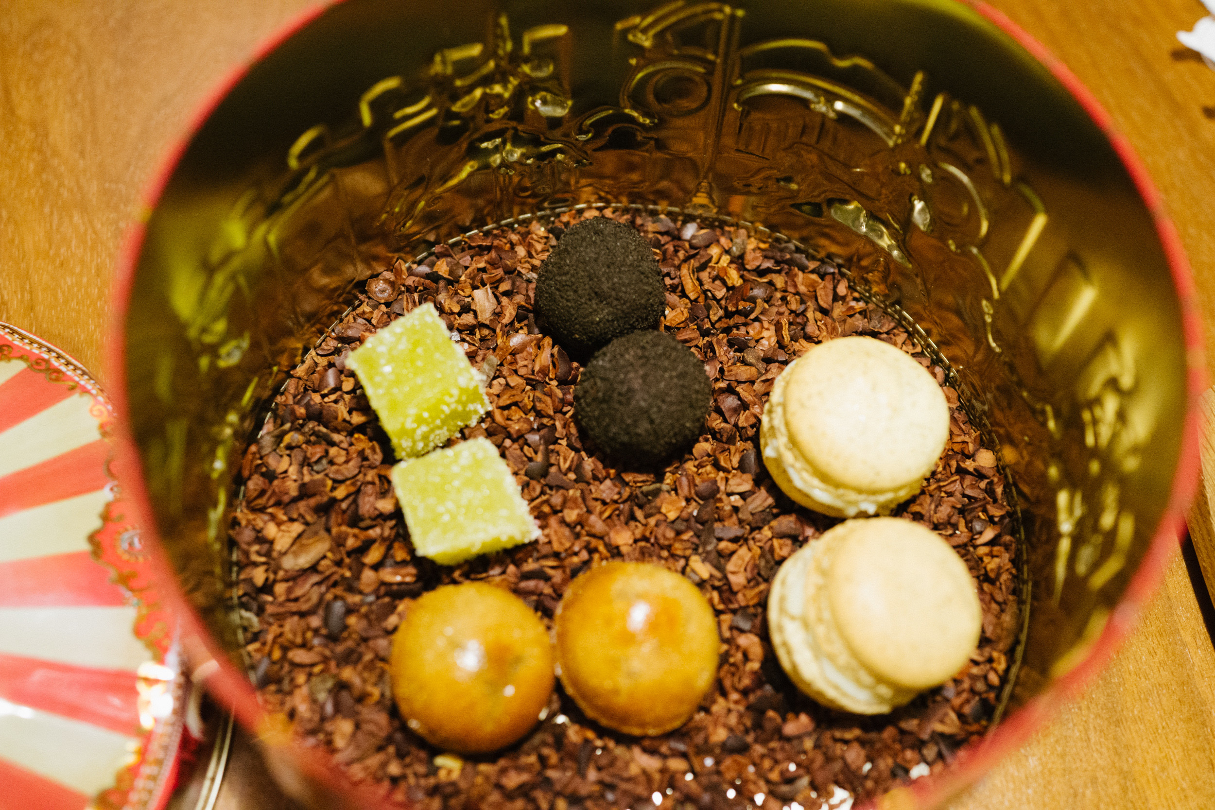 あっという間にラストのデザート。今回もかわいい缶に入っていたのはトリュフのほか、ライチやジャスミン、そしてオリーブオイルのグミ。オリーブオイルのグミは何度食べても斬新さがある。デザートなのにおつまみみたいだ。