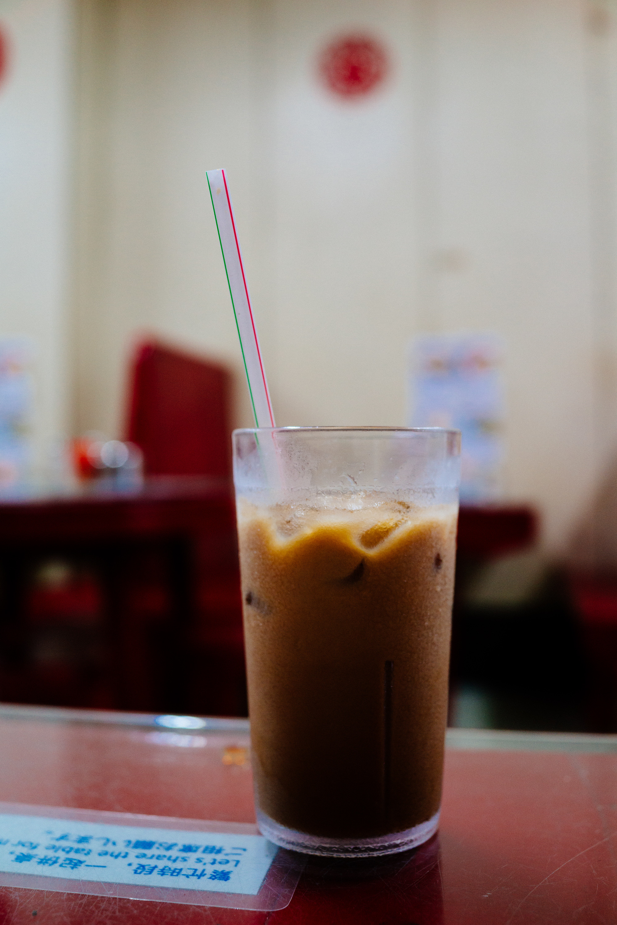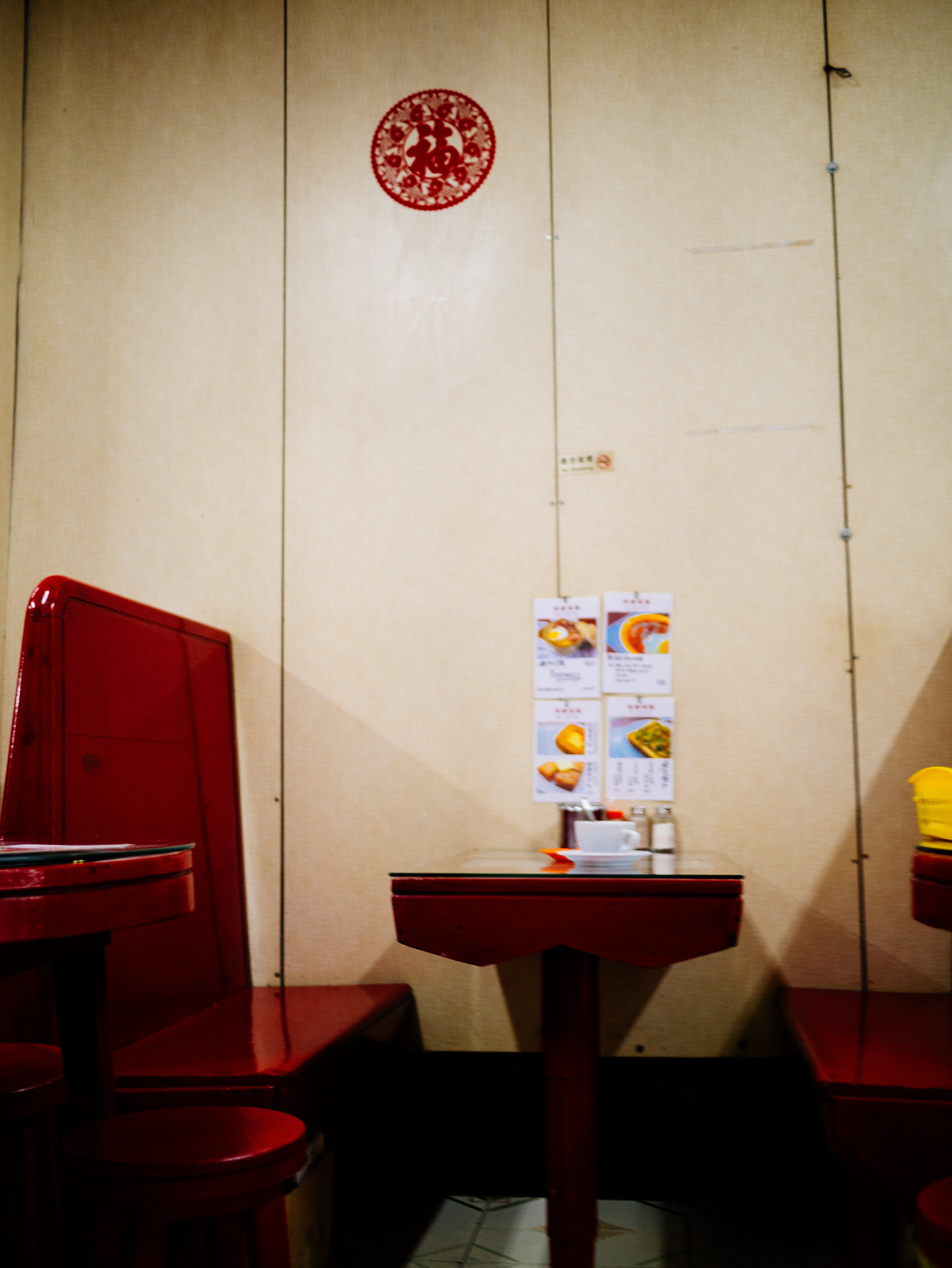 赤い椅子やくすんだ壁の色は香港映画に出てきそうな雰囲気。椅子は狭くて座り心地がいいわけではないが、テーブルとかも含めて味がある世界観を作りだしている。そろそろ暑くなる時間帯を冰室で過ごすこともあり、アイスコーヒーを頼んで涼みながら時間を過ごす。